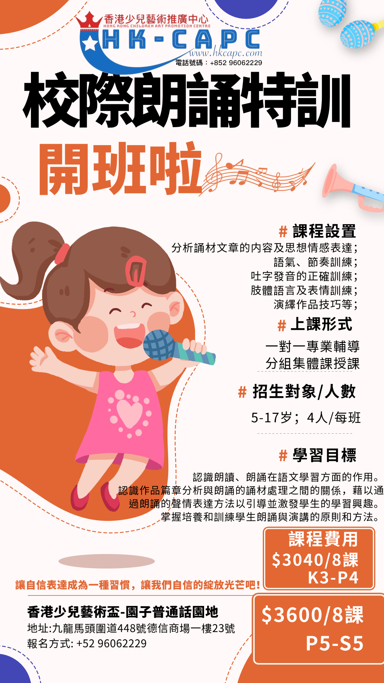 一項能提升小朋友的語言能力; 能啓發小朋友的藝術天賦,鍛煉小朋友的表演技巧; 能豐富小朋友的舞台經驗,從而增加小朋友的自信心; 全面發展,並能在升學過程獲得莫大益處,香港少兒語言藝術朗誦課程期待您的參與